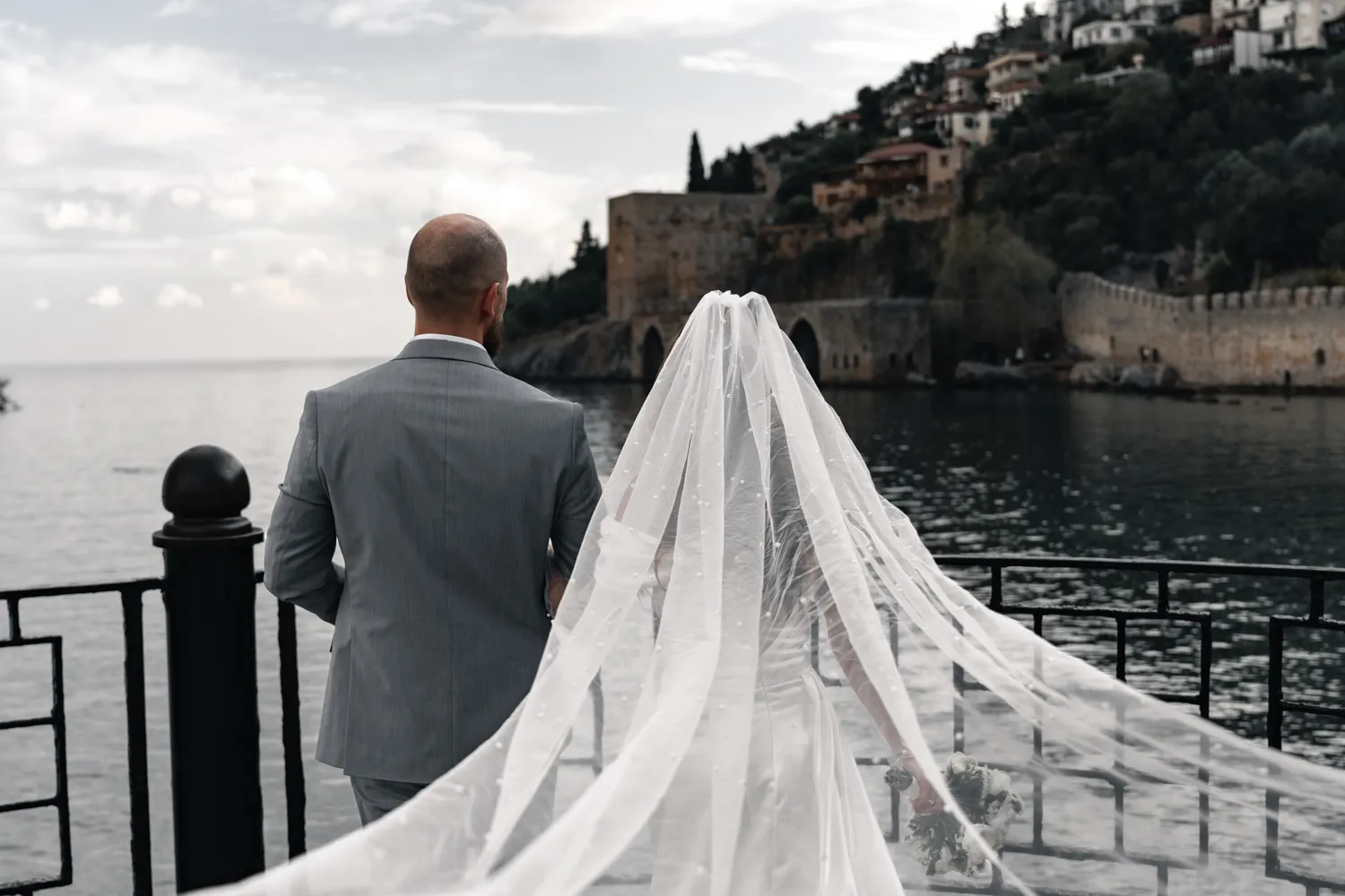We strolled through the old historical town of Alanya, where we visited the special gate dedicated to newly-wedded couples—a traditional spot where every bride and groom pass under it for good luck. This gate is located above the Alanya peninsula, offering a beautiful view. During this time, we shot all the natural, moment-style photos as Ksenia and S walked, explored, and enjoyed themselves, and we captured video throughout the entire journey as well.